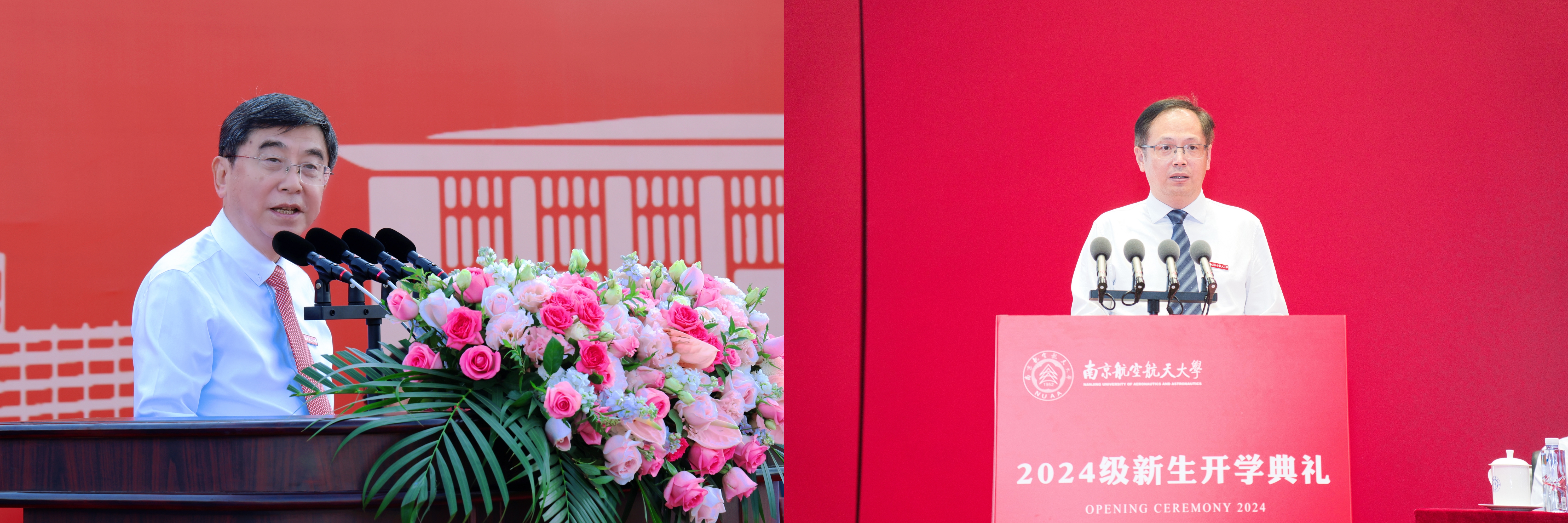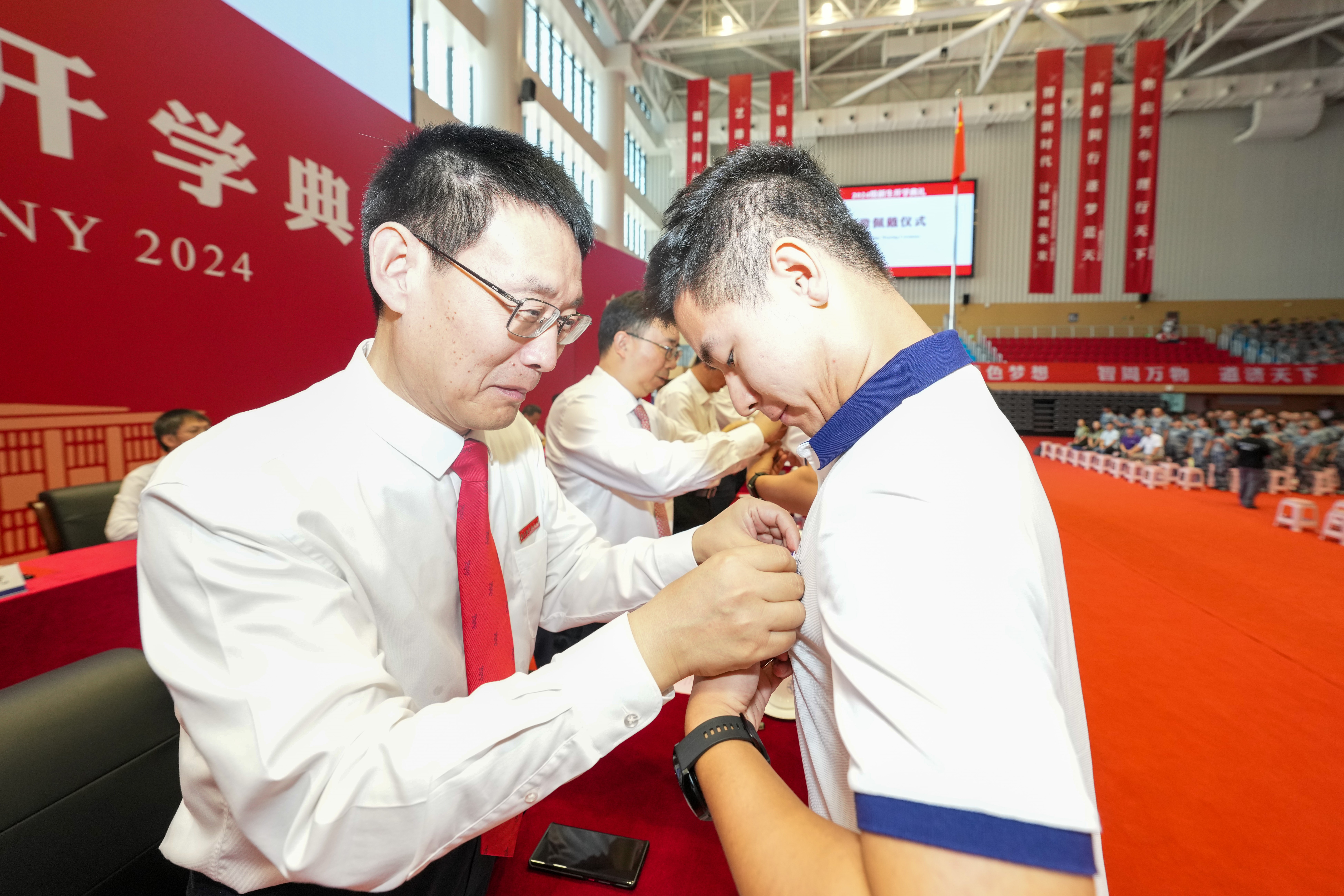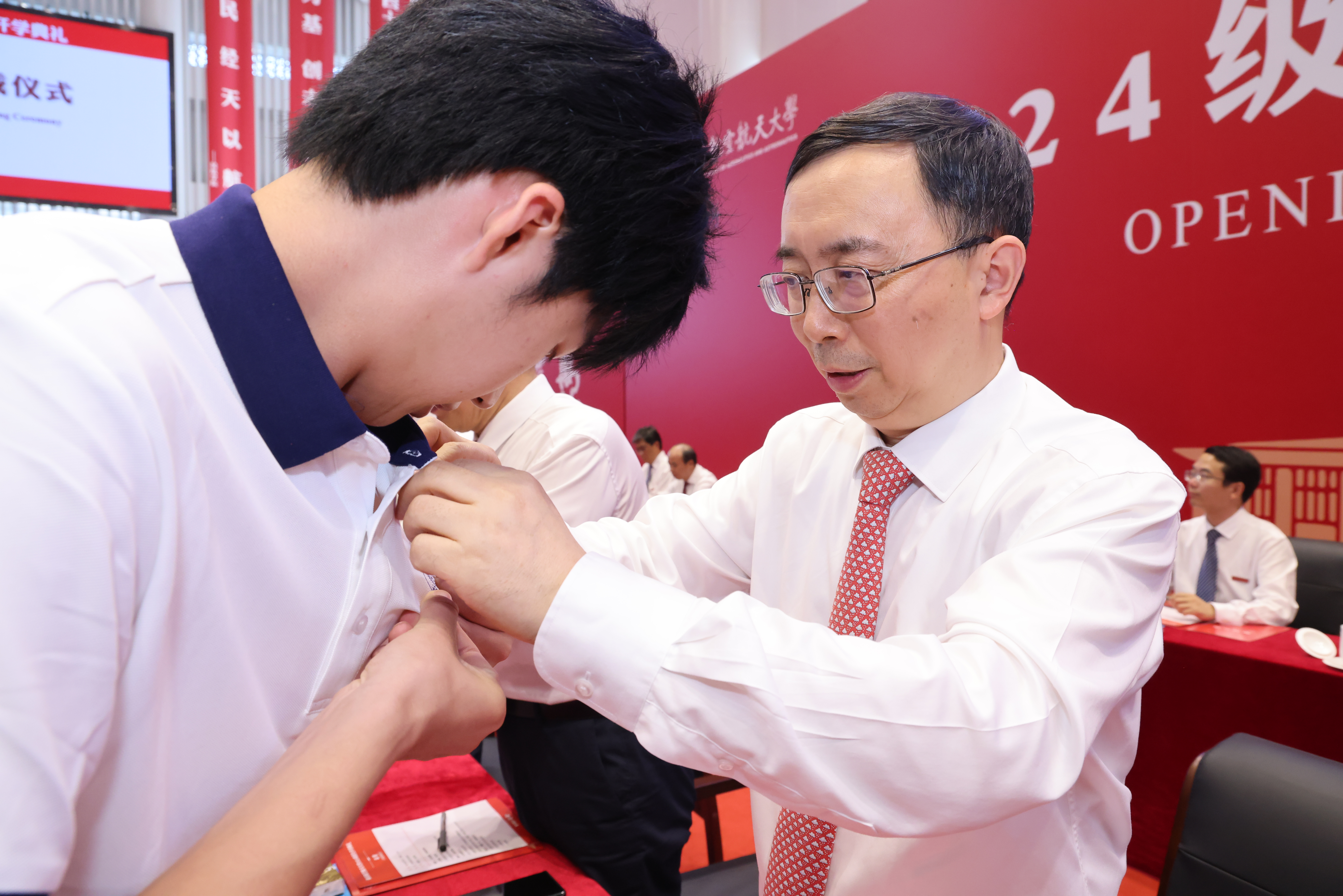 全体校领导和嘉宾为2024级新生代表佩戴南航校徽,台下全体新生共同佩戴校徽,宣告自己成为一名真正的南航人。