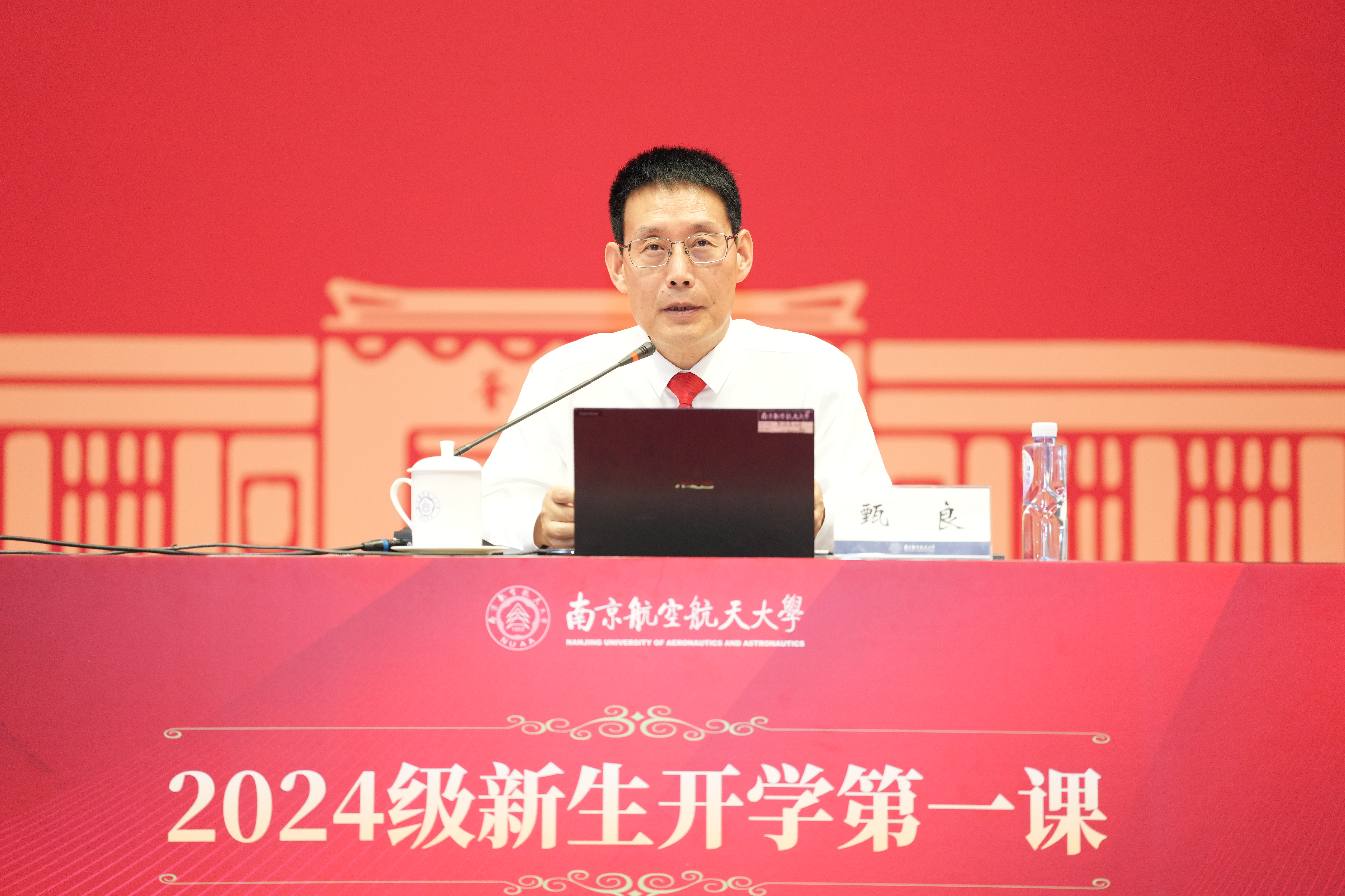 甄良热烈祝贺大家以优异的表现成就大学梦、启航新征程,对大家来到美丽的南航校园、成为新的南航人表示热烈欢迎。他深刻分析了世界科技革命和产业变革呈现的新特点、我国经济社会发展所处的新方位以及国防军工行业发展面临的新挑战。他指出,党的二十届三中全会对进一步全面深化改革、推进中国式现代化作出一系列战略部署,为我们全面建设社会主义现代化国家、向第二个百年奋斗目标阔步迈进指明了前进方向。同学们选择南航,就选择了与祖国同向同行,希望同学们不畏艰难、不惧挑战,以实际行动践行南航人的初心使命,努力成为我国航空航天民航事业的栋梁之才。