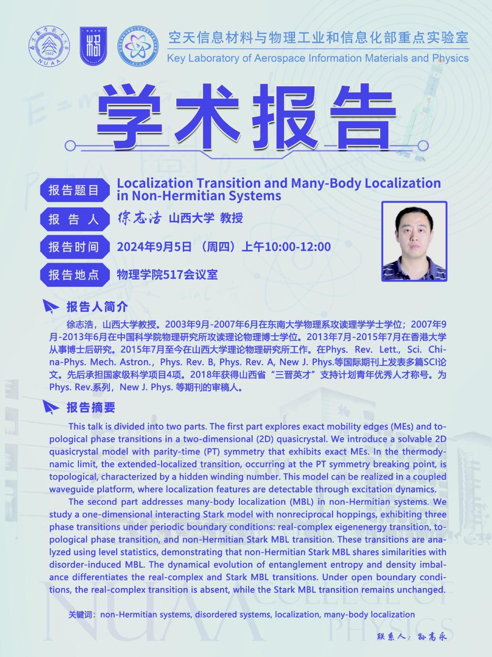 报告题目:Localization Transition and Many-Body Localization in Non-Hermitian Systems