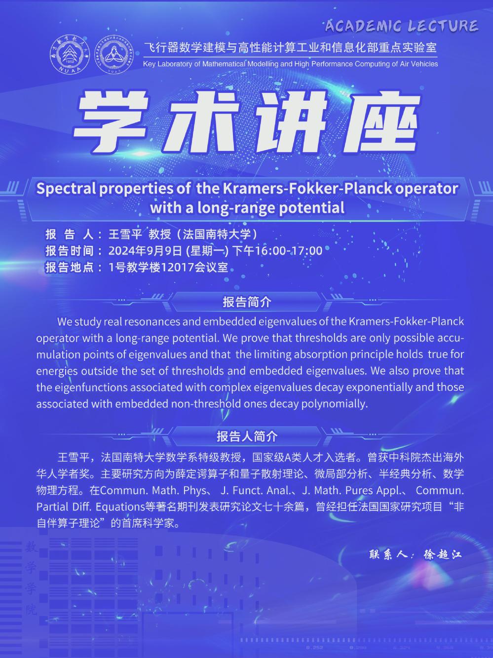 报告题目:Spectral properties of the Kramers-Fokker-Planck operator with a long-range potential