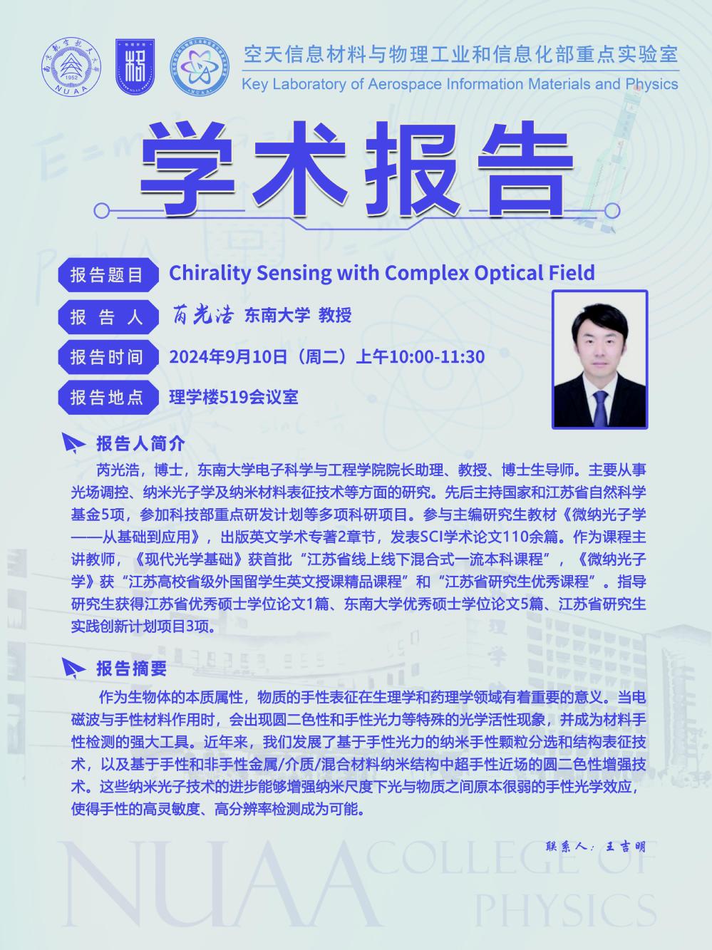 报告题目:Chirality Sensing with Complex Optical Field