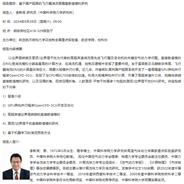 报告题目:基于国产超算的飞行器湍流高精度数值模拟研究