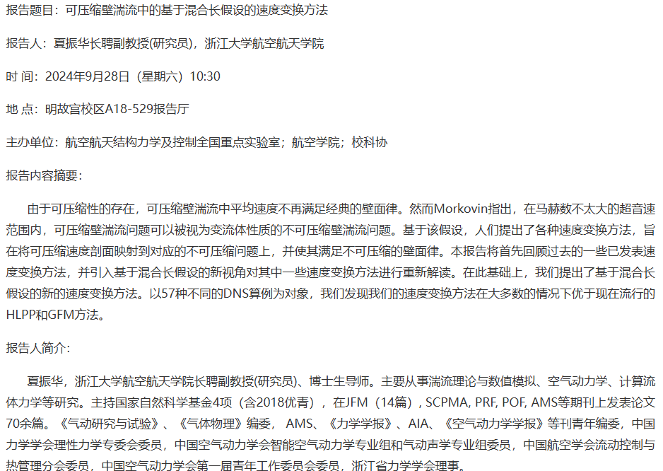 报告题目:可压缩壁湍流中的基于混合长假设的速度变换方法