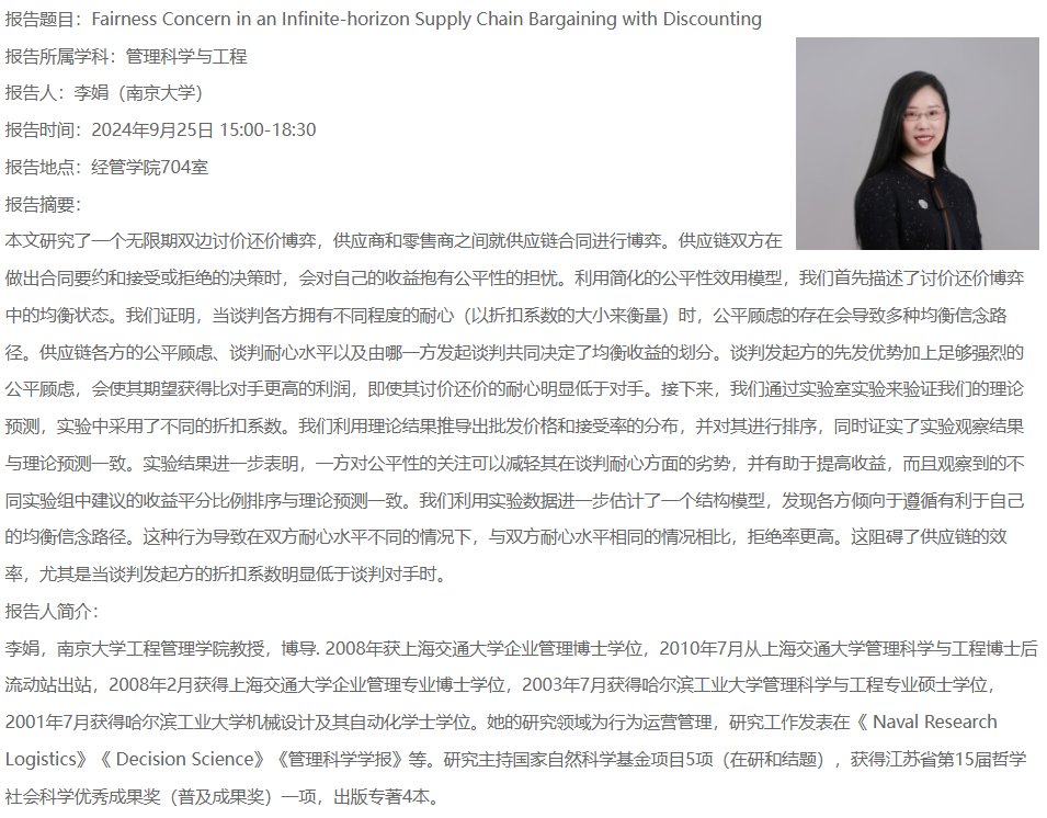 报告题目:Fairness Concern in an Infinite-horizon Supply Chain Bargaining with Discounting