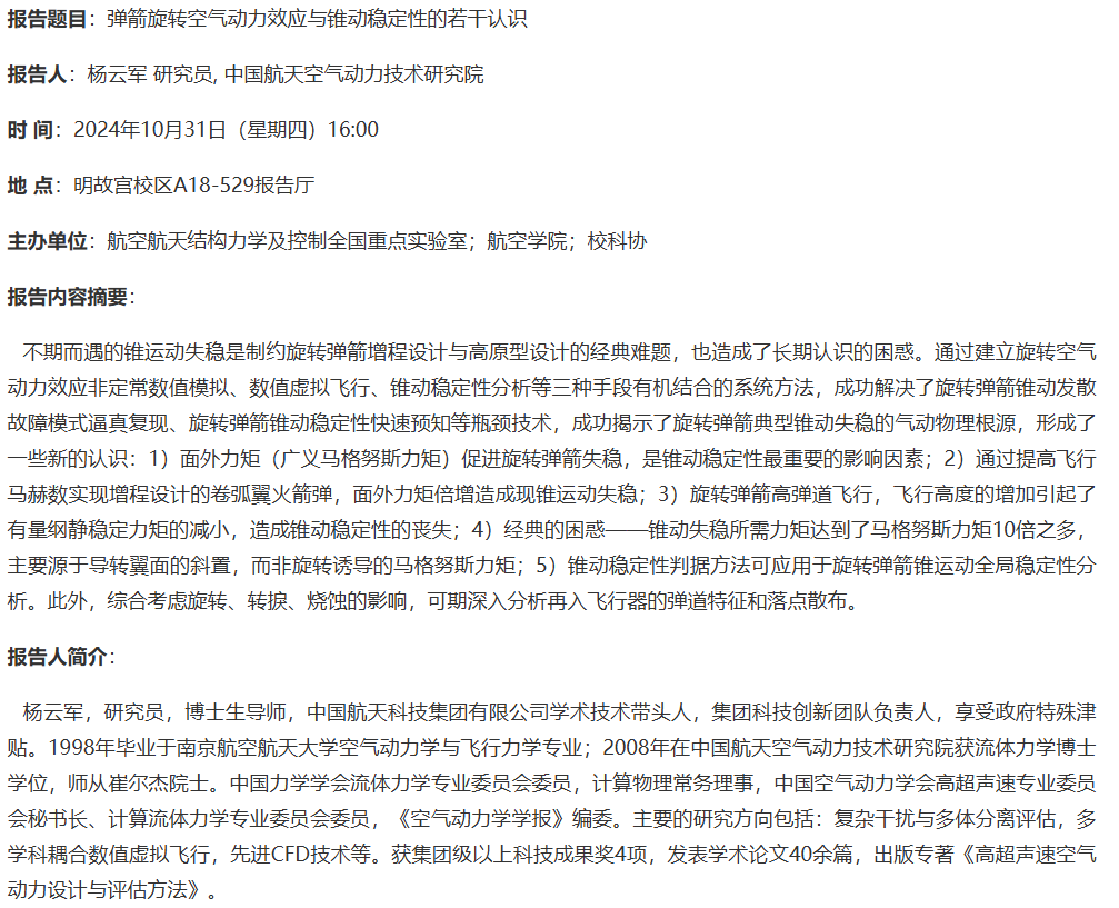报告题目:弹箭旋转空气动力效应与锥动稳定性的若干认识