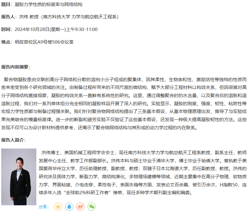 报告题目:凝胶力学性质的标度率与网络结构