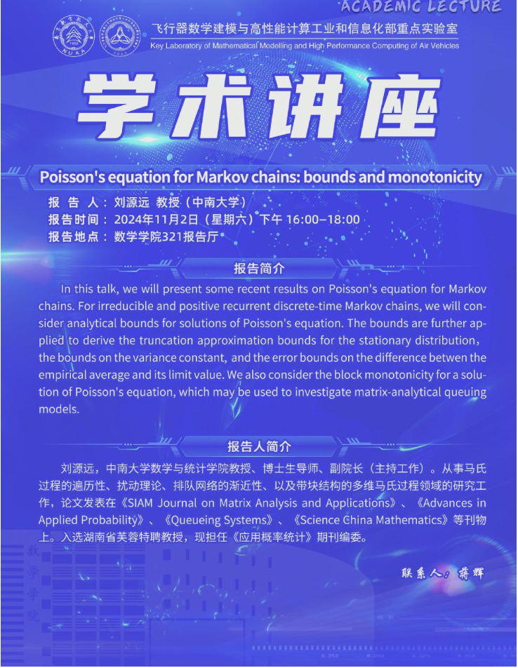 报告题目:Poisson’s equation for Markov chains:bounds and monotonicity