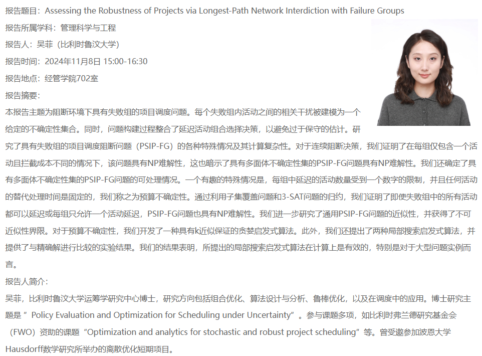 报告题目:Assessing the Robustness of Projects via Longest-Path Network Interdiction with Failure Groups