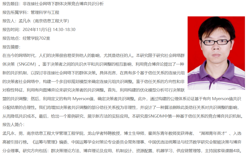 报告题目:非连接社会网络下群体决策竞合博弈共识分析