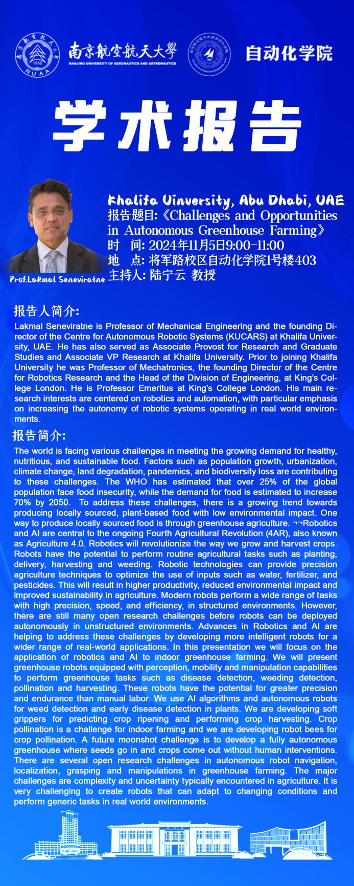 报告题目:Challenges and Opportunities in Autonomous Greenhouse Farming