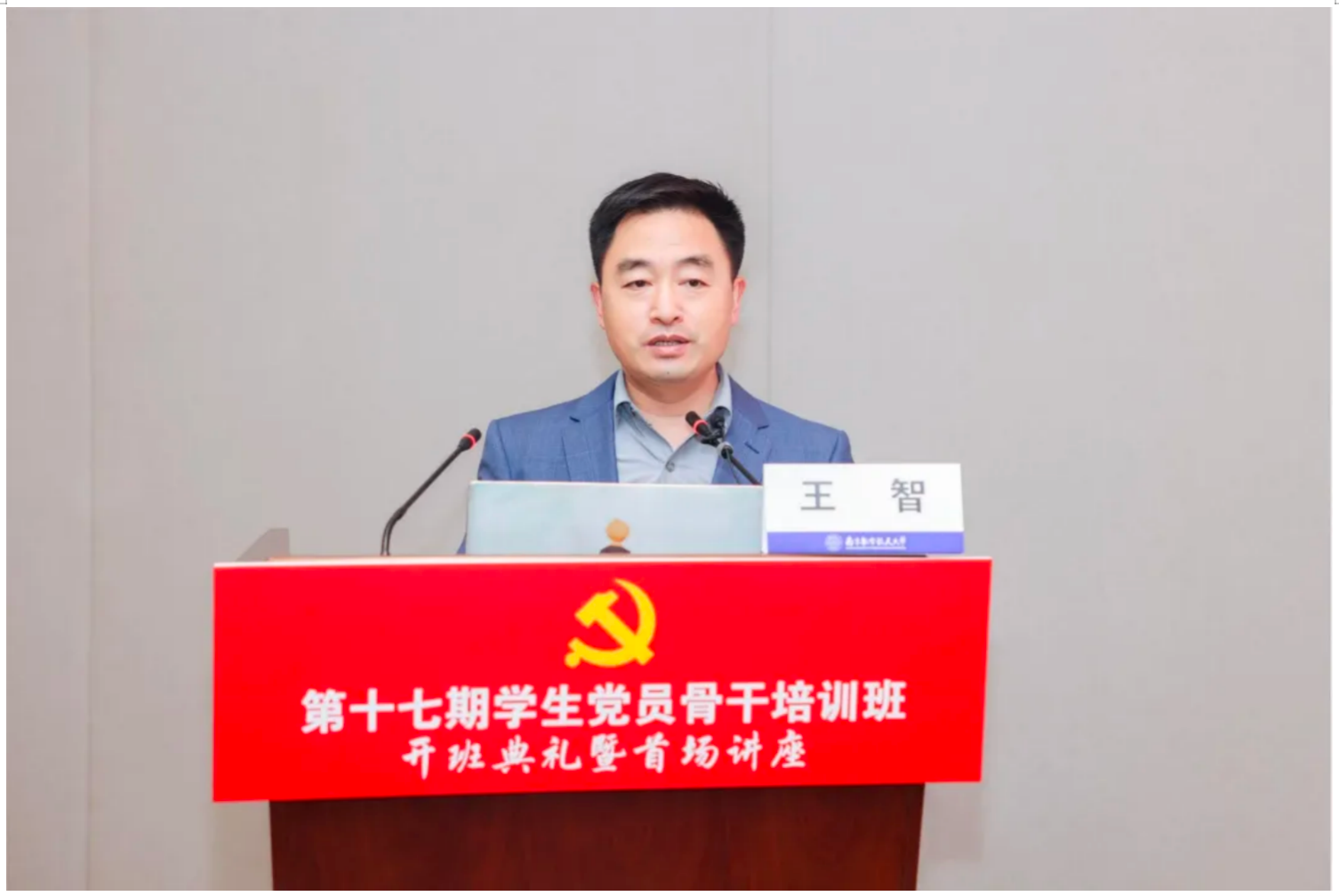 为学习贯彻党的二十届三中全会精神,加强学生党员骨干培养,提升学生党建工作水平,11月14日,我校第十七期学生党员骨干培训班开班典礼暨首场讲座在将军路校区材料学院东区楼B501报告厅举行。马克思主义学院院长王智以《进一步全面深化改革 推进中国式现代化——学习贯彻党的二十届三中全会精神》为题讲授专题党课。党委统战部副部长、组织部副部长单冠贤、党委研工部副部长雷蕾、党委学工部副部长佘明,各学院负责学生党建工作辅导员和学生党员骨干培训班全体学员参加活动。