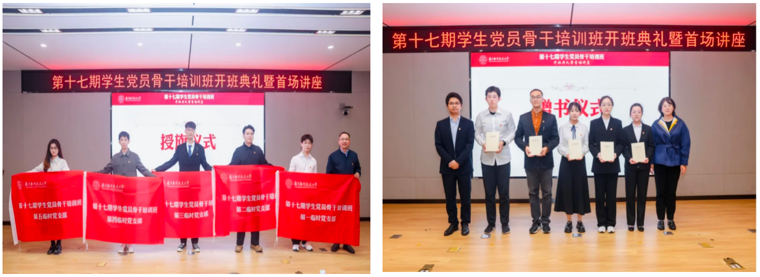 本期学生党员骨干培训班结合校区、学院和专业等,成立了5个临时党支部。开班典礼上,单冠贤为临时党支部授予支部旗。雷蕾、佘明为本次学生党员骨干培训班赠书,希望党员同志们不断夯实自身理论基础,始终坚持以习近平新时代中国特色社会主义思想武装头脑、指导实践。