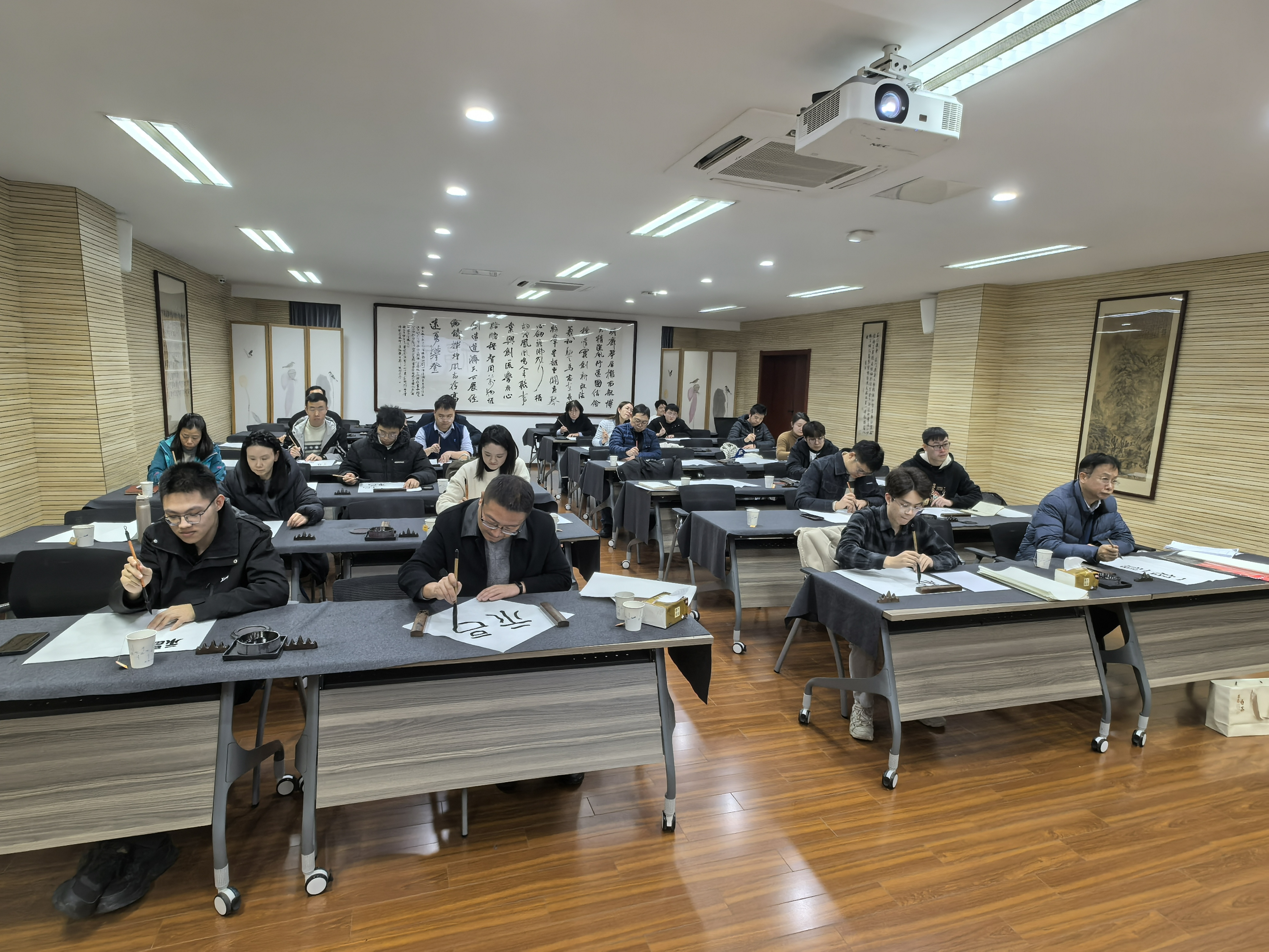 党课结束后,全体党员在书法老师张星星的指导下,学习了书法艺术的特点和用笔要点,并现场进行了书法学习和创作。党员师生们现场共同书写“福”字,表达了对研究生学业有成、生活美满的美好祝愿。