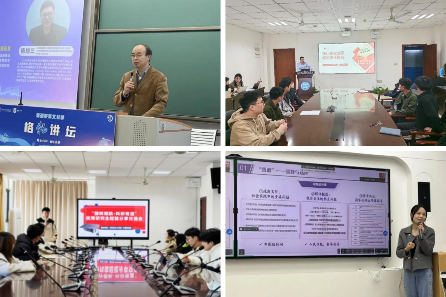 机电学院、计算机科学与技术学院/软件学院、人工智能学院以年级大会、专题讲座、党课团课等方式深入学习、大力弘扬新时代科学家精神。并结合实际案例,开展学术不端、保密安全等警示教育,强化底线思维。能源与动力学院、马克思主义学院、人文与社会科学学院邀请优秀校友、国家奖学金获奖者代表,结合自身学习、工作经历,以“思政一刻钟”组会、主题演讲等方式进行成果展示和经验分享,发挥朋辈引领作用,在科研道路上结伴前行。自动化学院、物理学院结合专业特色,充分调动导师积极性,发挥研究生工作组功能,从关键细节入手,打造学院研究生学风建设小微化工作品牌,不断丰富研究生学风建设载体平台,增强教育实效。