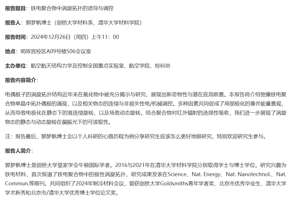 报告人:郭梦帆博士(剑桥大学材料系、清华大学材料学院)