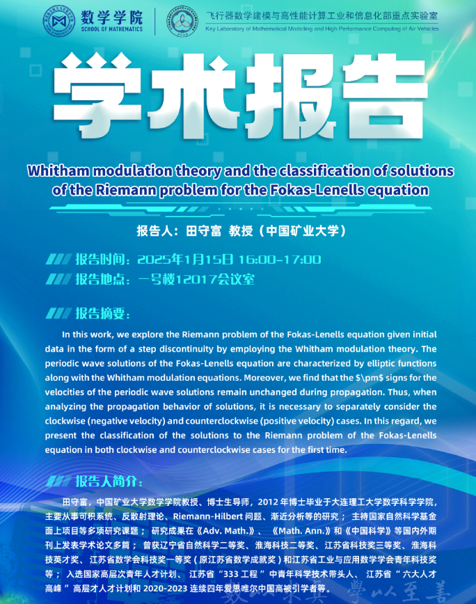 报告题目:Whitham modulation theory and the classification of solutions of the Riemann problem for the Fokas-Lenells equation