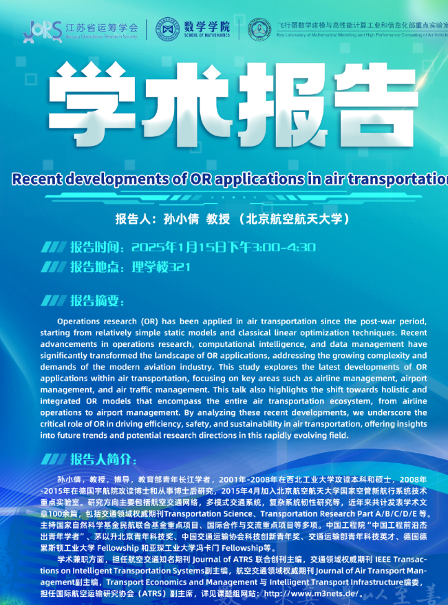 报告题目:Recent developments of Or applications in air transportation