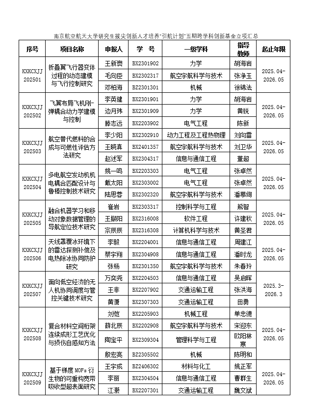 根据南京航空航天大学《研究生拔尖创新人才培养“引航计划”实施方案》(校研字〔2020〕13号),研究生院面向“引航计划”五期组织开展了2025年度跨学科创新基金项目申报工作,经学生申报、现场答辩、研究生院组织专家评审,决定对9个项目予以立项资助,具体名单详见附件。