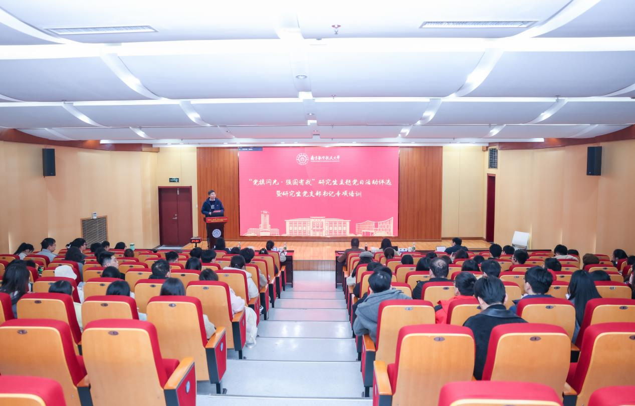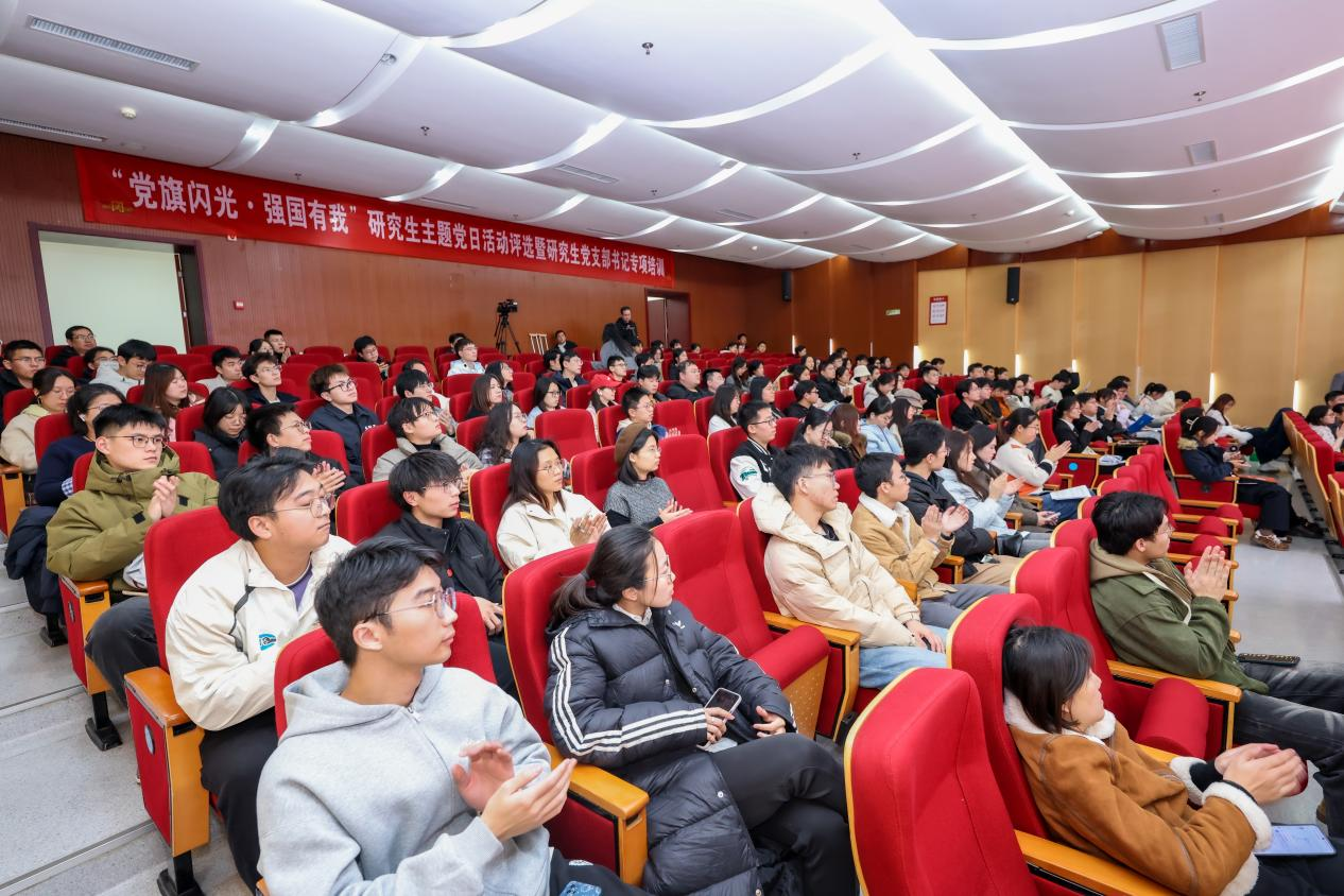 在全校上下深入学习贯彻党的二十届四中全会精神,统筹谋划“十年行动计划”、科学编制“十五五”规划之际,为进一步推动研究生党建工作的高水平实施和高质量发展,11月18日晚,“党旗闪光·强国有我”研究生主题党日活动评选暨研究生党支部书记专项培训在将军路校区图书馆报告厅隆重举行。评选工作由学校相关职能部门负责人担任专家评委,研究生导师代表、研究生辅导员代表、各学院研究生党支部书记等200余人在线上、线下共同参加专项培训。