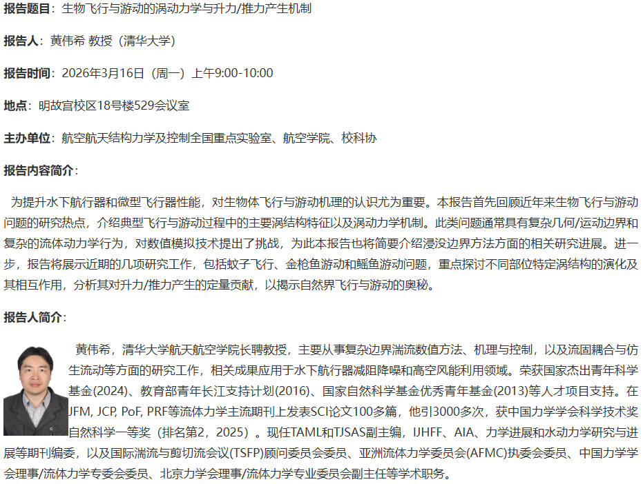 报告题目:生物飞行与游动的涡动力学与升力/推力产生机制