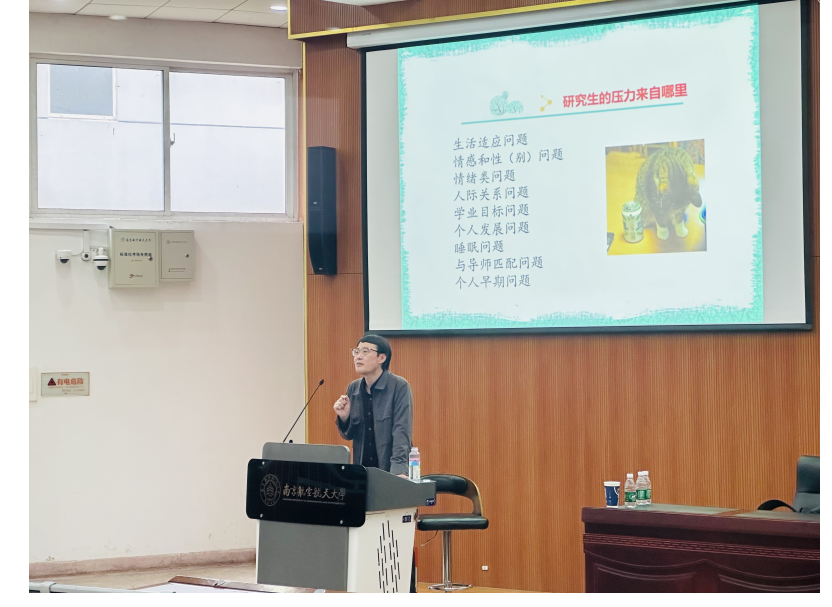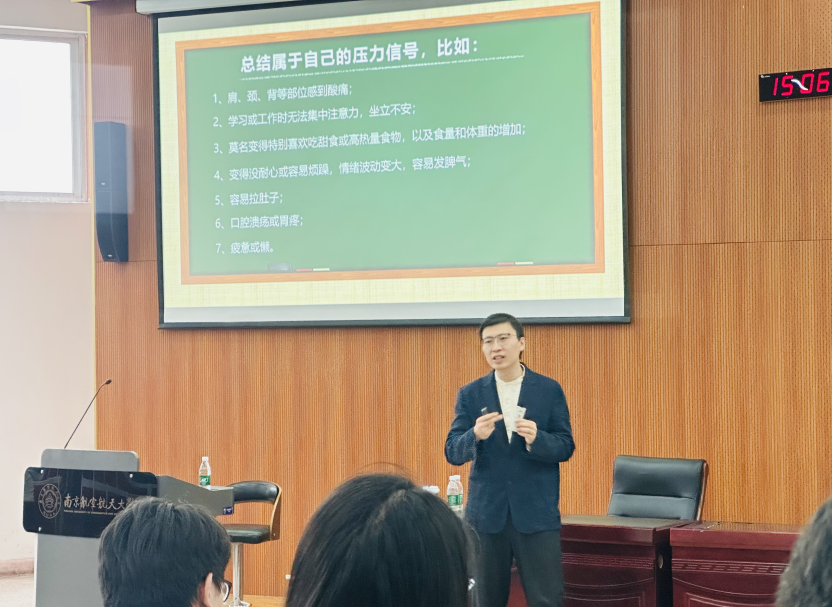 南京医科大学王志琳老师、南京师范大学裴涛老师带来“研究生异常心理识别与危机预防”专题讲授。系统梳理了研究生常见异常心理的典型表现、预警信号与识别要点,密切关注同学心理状况,关心关爱身边同学,学会及时向专业人员求助,合理规避自身心理压力。