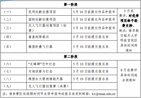 (2)“反蜂群”空中打击、对地侦察与打击、模型水火箭助推航天器、垂直起降载运、微型折叠飞行器、无人飞行器创意赛(决赛)只设冠亚季军。大赛将颁发证书和奖励。
