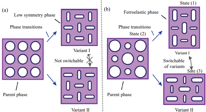 模式转换可调刚度力学超材料指的是在外力变形条件下,给定的二维多孔软材料模板出现了一种可调节杨氏模量的力学行为。可调杨氏模量力学超材料主要利用弹性材料的结构不稳定性, 由力学拉胀而引起的材料响应软化、切线模量的衰减、可反转的弹性不稳定性去激发不同样式的变化。