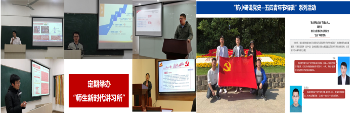 团队会定期组织成员以读书交流会为主要形式,定期举办“师生新时代讲习所”,邀请学院党政领导、马克思主义学院教师、优秀辅导员、团队成员担任主讲人,组织开展习近平新时代中国特色社会主义思想的学习、交流和培训,并以“课前预习+聆听主讲+互动讨论”的方式保证学习效果。在全国“两会”开幕、十九届六中全会等重大教育契机时间节点上,团队组织观看直播,提神振气、凝心聚力。今年上半年,团队还参加“航小研说党史--五四青年节特辑”活动,重温五四青年节光辉历程。