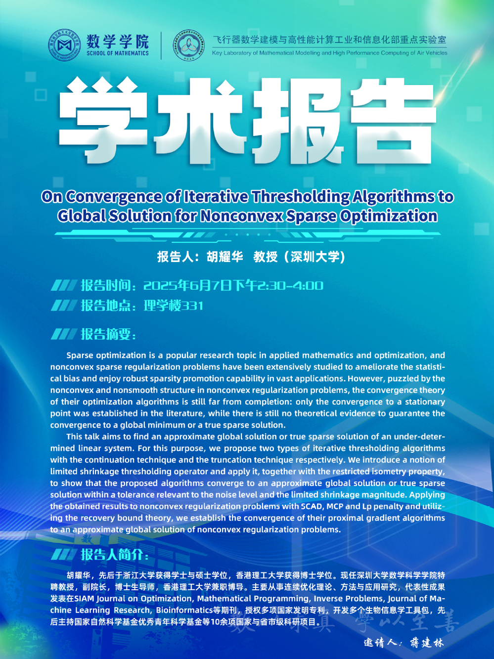 报告题目:On Convergence of Iterative Thersholding Algorithms to Global Solution for Nonconvex Sparse Optimization