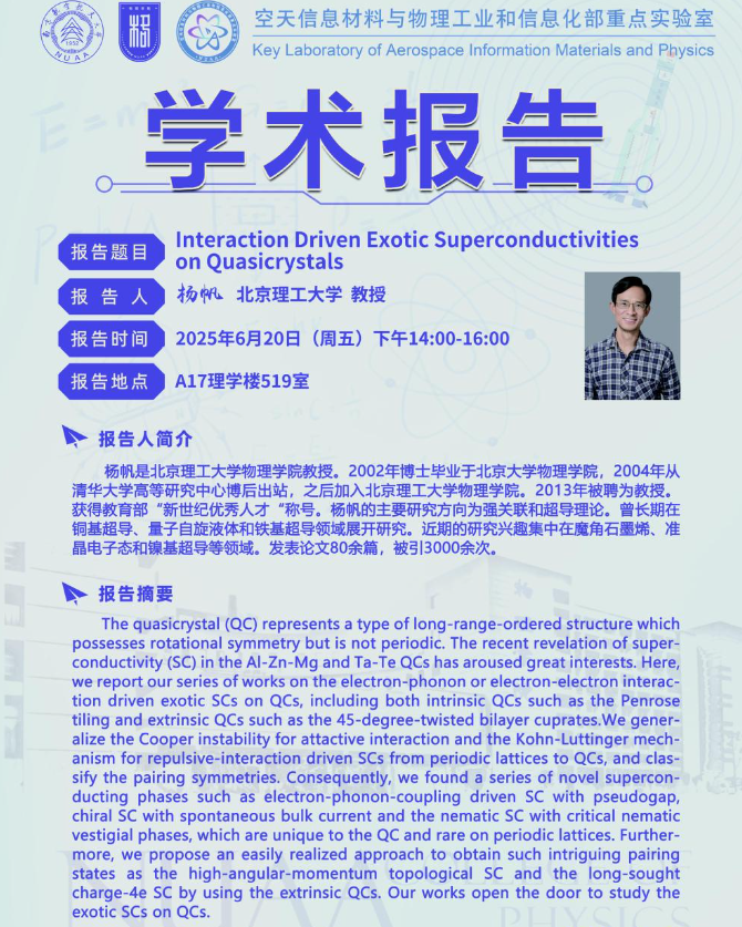 报告题目: Interaction Driven Exotic Superconductivities on Quasicrystals