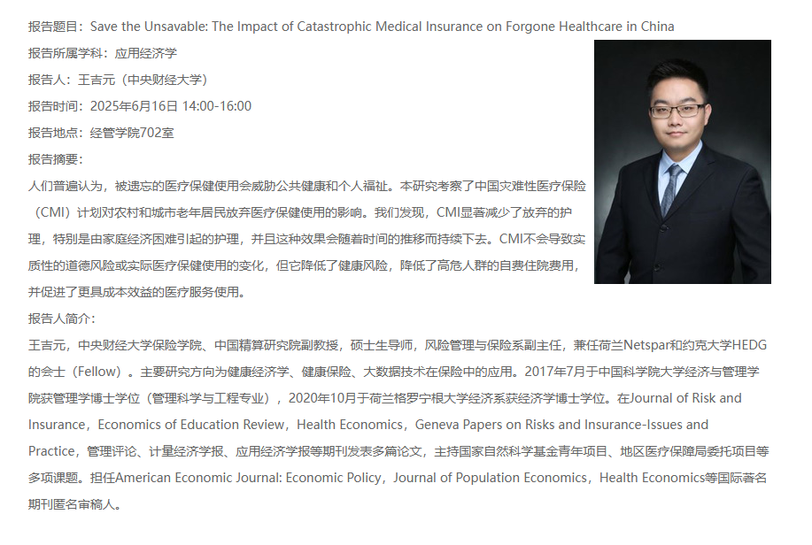 报告题目: Save the Unsavable:The Impact of Catastrophic Medical Insurance on Forgone Healthcare in China