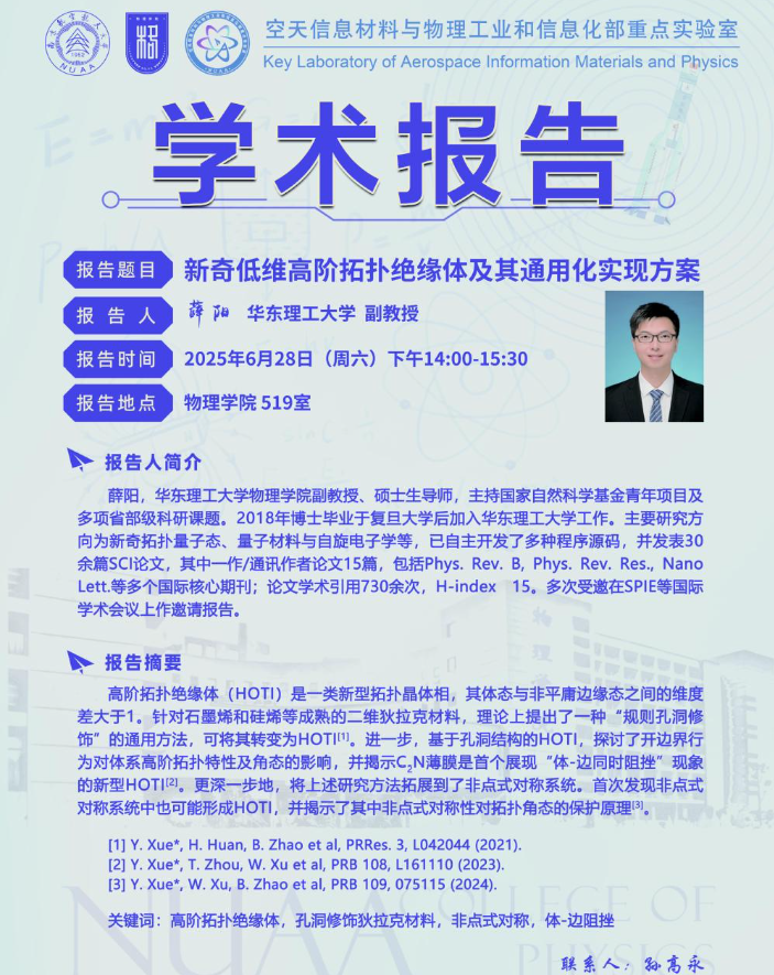 报告题目:新奇低维高阶拓扑绝缘体及其通用化实现方案