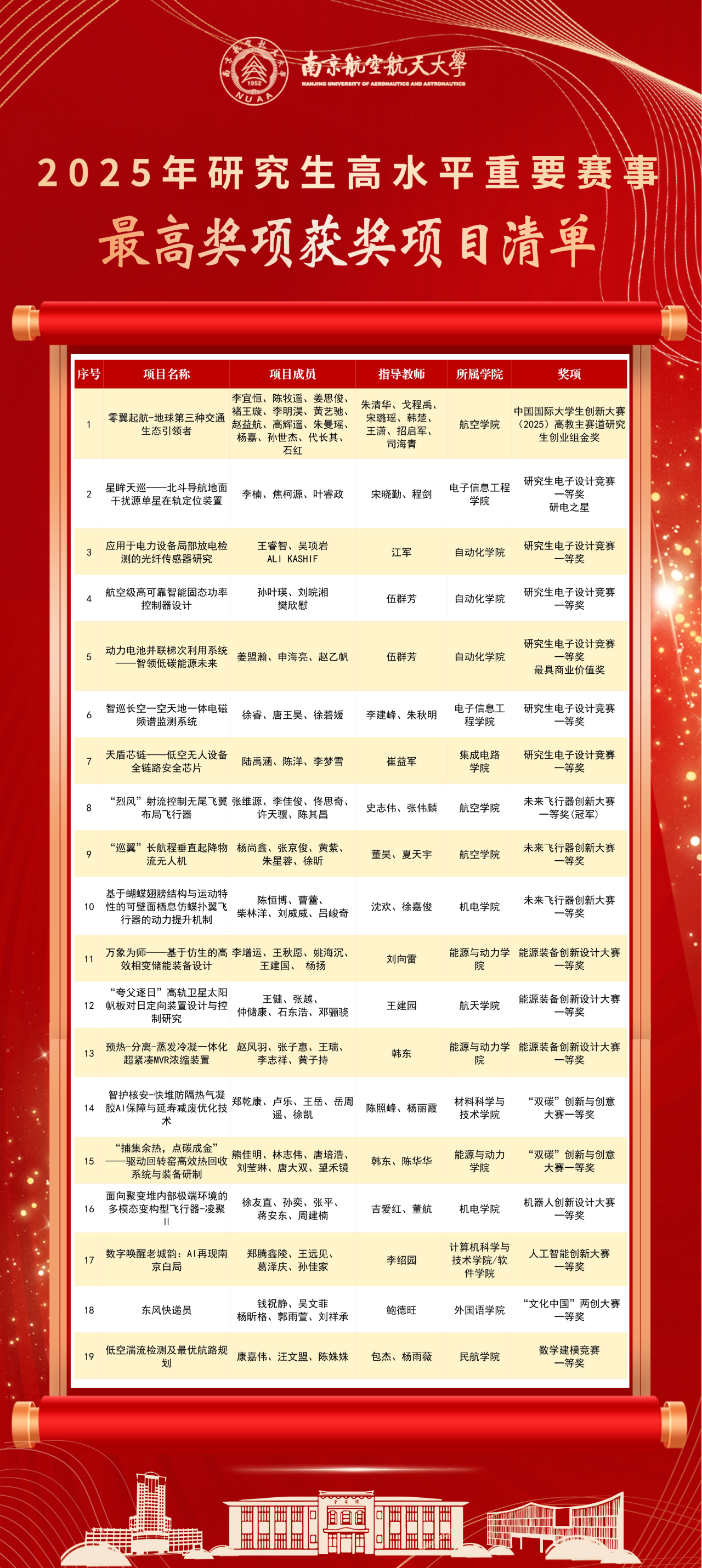 多年来,学校研究生教育坚持以“立德树人、服务需求、提高质量、追求卓越”为主线,研究生创新实践能力培养做到政策有支撑、推进有路径、保障有力度,以高水平科研成果支撑高质量人才培养,书写了学科竞赛与人才培养同频共振的南航答卷。其中,在中国国际大学生创新大赛中,“零翼起航-地球第三种交通生态引领者”项目勇夺省赛冠军,全国总决赛中共获得高教主赛道研究生创业组金奖1项,高教主赛道研究生创意组银奖1项、铜奖1项,获奖总数再创新高!在中国研究生创新实践系列大赛中,南航研究生共斩获一等奖18项,二等奖72项,三等奖97项,首夺中国研究生电子设计竞赛“研电之星“,再获中国研究生未来飞行器创新大赛冠军,赛事成绩实现从数量突破到质量跃升!