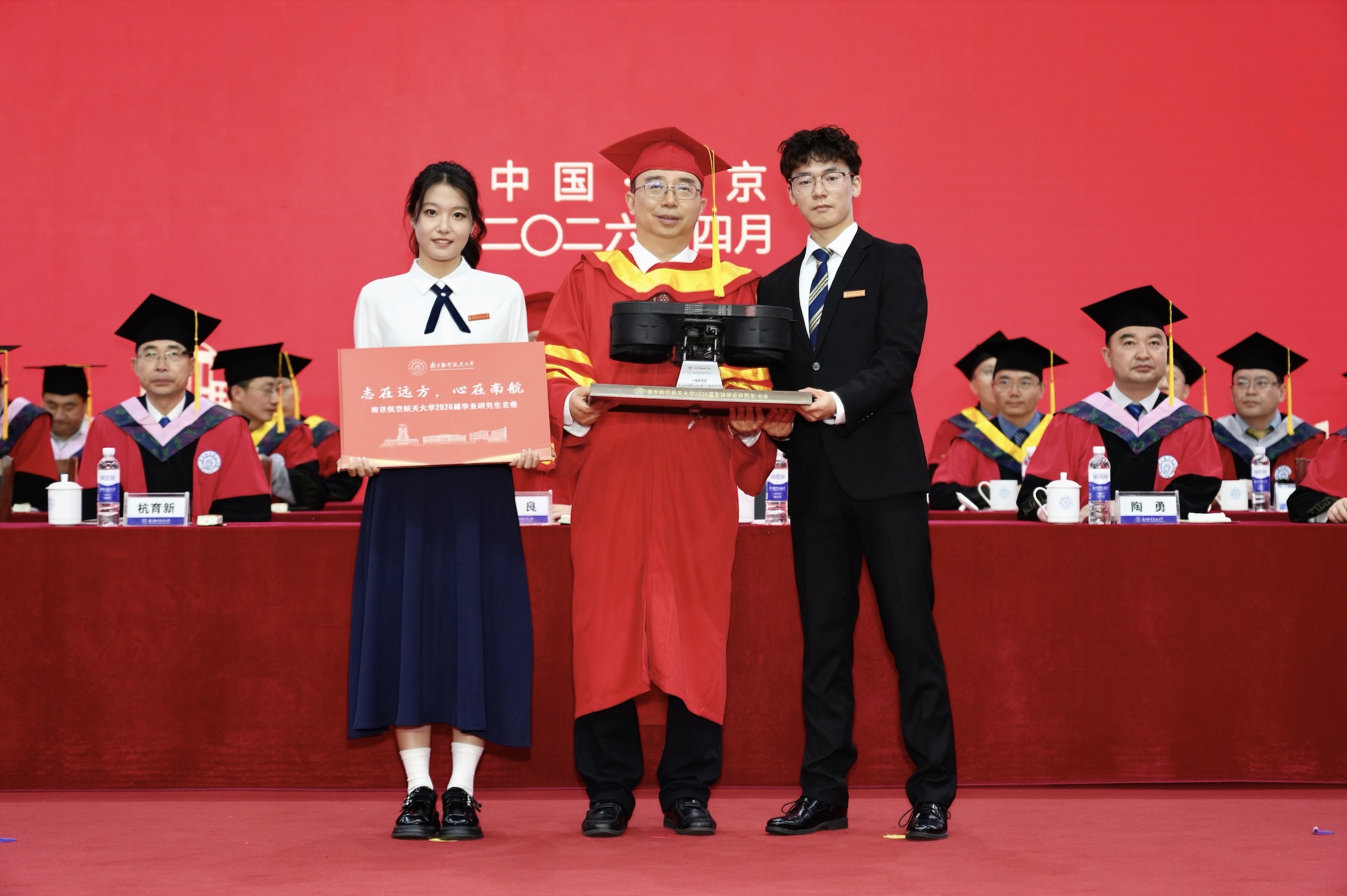 典礼上,机电学院运动仿生与智能机器人实验室的徐友直同学和集成电路学院校友大使尤嘉琪同学代表全体研究生为学校送上了一份特殊的礼物——由研究生团队自主研发的面向聚变堆内部极端环境的多模态变构型飞行器“凌聚Ⅱ”和2026届毕业研究生名册,展现了南航学子心系母校的情怀与志在远方的理想。姜斌校长代表学校接受赠礼。